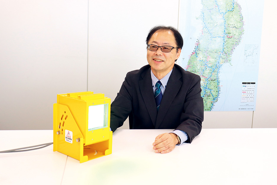 雪の多い東北地方では冬季に、高速道路に積もった雪を取り除くための除雪作業車や、路面が凍らないように凍結防止剤を散布する散布車が高速道路を走っています。「セーフティライン」は夜間、雪で見通しが悪い中でも安全・安心に走行できるように、積水樹脂株式会社と協力してさまざまなテストを繰り返し、開発した製品です。