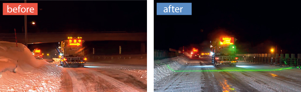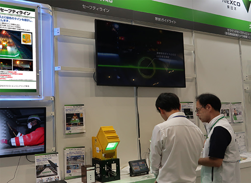 夜間作業中の車両とお客様の車両の安全を守るために開発された「セーフティライン」は、高速道路上に緑色のラインを照射することで安全運転をサポート。緑色のラインを1本の線で標示している点が新しく、全国に広がっています。
