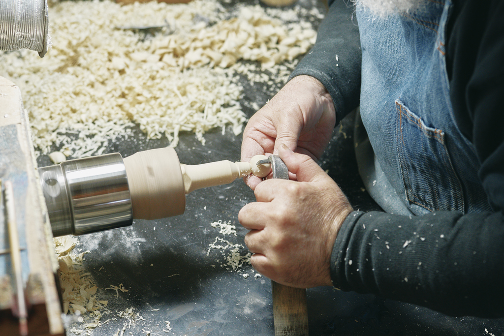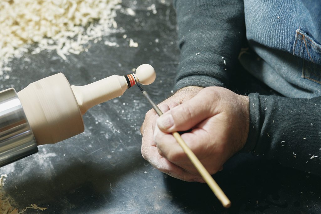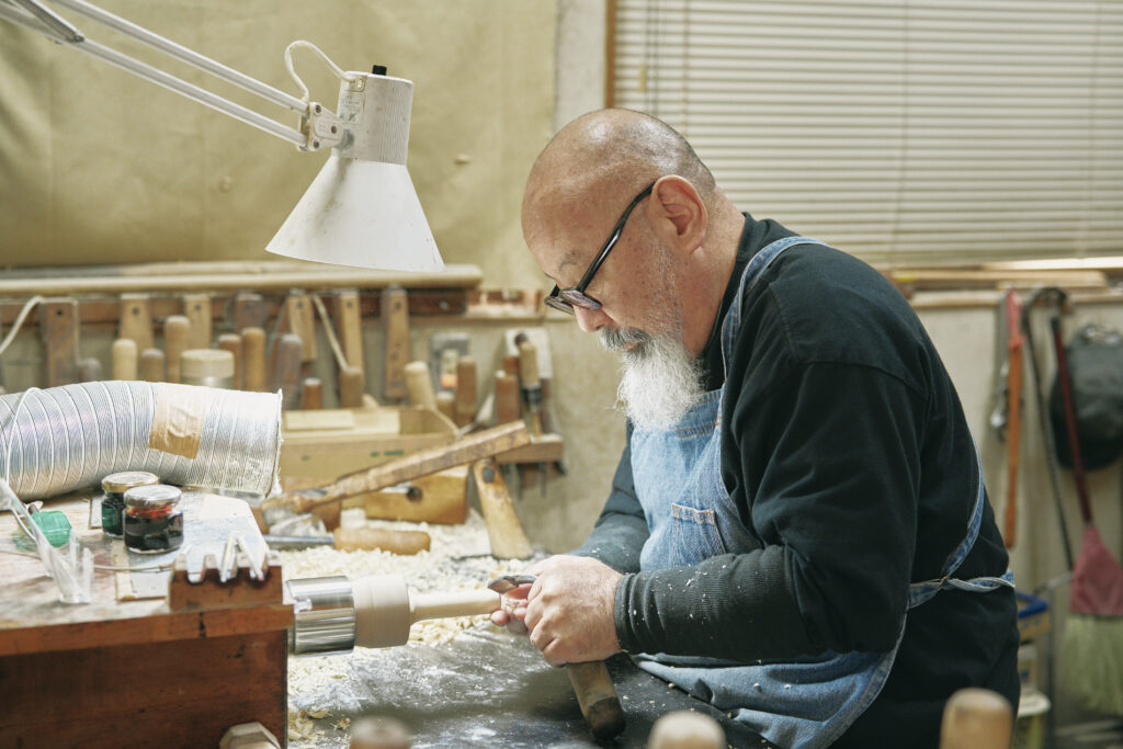 材料のミズキやイタヤカエデから、必要な大きさに削り出した木をろくろにセット。木に刃物を当てて、頭の中のデザイン案通りに手際よく削っていきます。回転を利用して胴体に色鮮やかなラインを引いて仕上げるまで、作業はリズミカルに進みます。絵付け体験のお客さまとの対話から、デザインのヒントをいただくことも多いそうです。