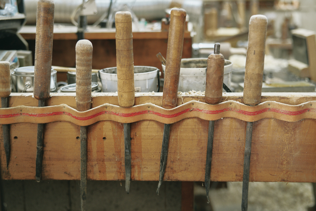 道具も自作する工人だからこそ、「かわいいこけし」専用の道具も自作。絵付け用の筆の太さの調整から、木を削る刃物も自ら鍛冶(かじ)をして先端を小さく仕上げて使用しています。
