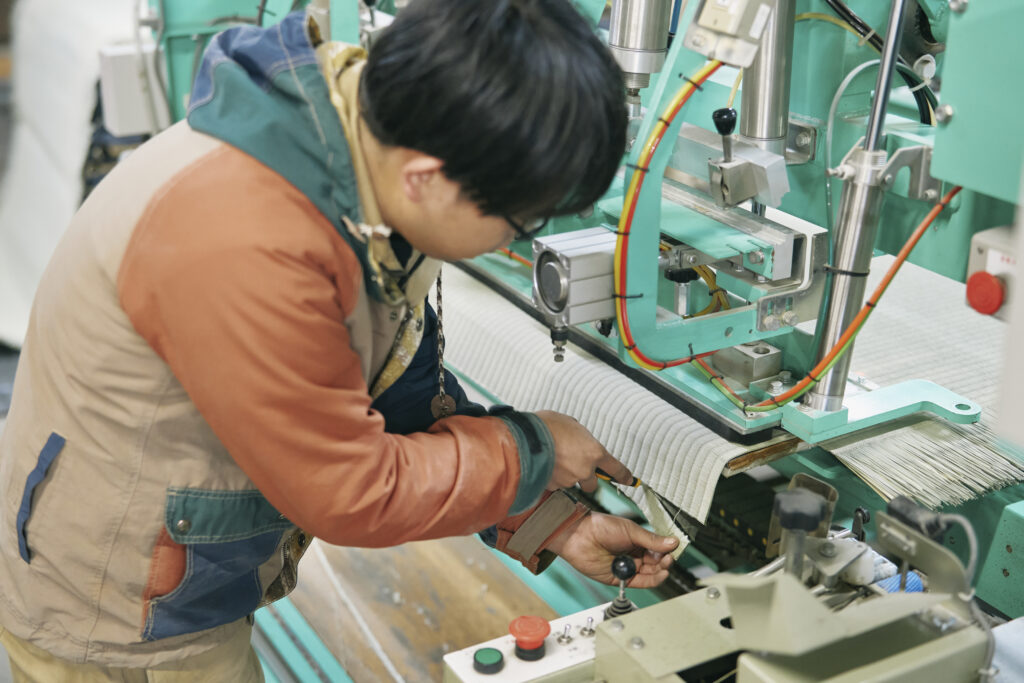 新製品「XT」に用いられる変形加工も、基本になるのは伝統製法の技術。藁畳床の仕上がり寸法の何倍もの高さに積み重ねた稲藁を縫って圧縮し、心地良い弾力性を生み出します。